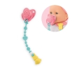 lorsque l'on appuie dessus et peut être attachée au vêtement du poupon à l'aide d'une chaîne avec un clip. Elle fonctionne avec 3