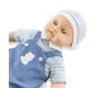 Il est habillé d'une tenue 2-en-1 composée d'une jolie salopette bleue et T-Shirt rayé et coiffé d'un bonnet assorti.