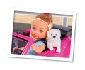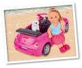 De kleine Evi trekt er op uit! Rijd in een flashy roze cabriolet rond: met de wind in je haren en je hondje op de achterbank beleef je samen de leukste momenten. Laat je meevoeren naar een zonnig plekje, geniet er van een picknick en rijd daarna gewoon verder. De knalroze Volkswagen Beetle is 22cm groot, de pop is 7cm.