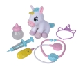 De schattige pluche eenhoorn met blauwe staart wordt geleverd in een koffer van 23x20cm met allerlei doktersaccessoires. Je kunt hem voeden met de fles, luisteren met de stethoscoop, de temperatuur opnemen of een injectie geven. De 20 cm hoge eenhoorn kan gemakkelijk overal in de transportdoos meegenomen worden . De set bevat ook een eenhoorn-hoofdband voor de kinderen. De dokterskoffer met pluche eenhoorn van Simba Toys is geschikt voor kinderen vanaf 3 jaar.